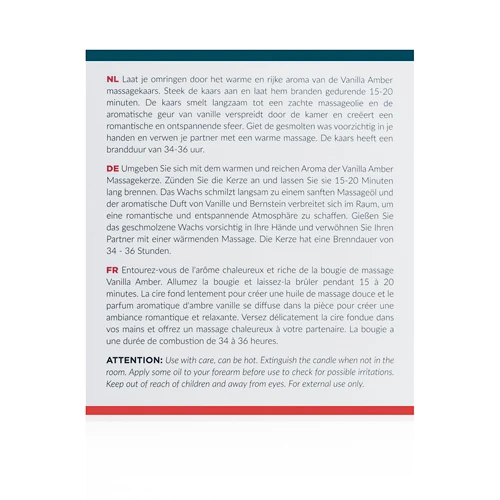 Let op: bij gebruik op een gevoelige huid kan verbranding of reactie van de huid optreden. Het is daarom aan te raden om de kaars altijd vooraf aan gebruik eerst op de huid te testen. Doe dit door de kaars na 1520 branden uit te blazen, een druppeltje was op je handen te gieten en op de huid te testen.