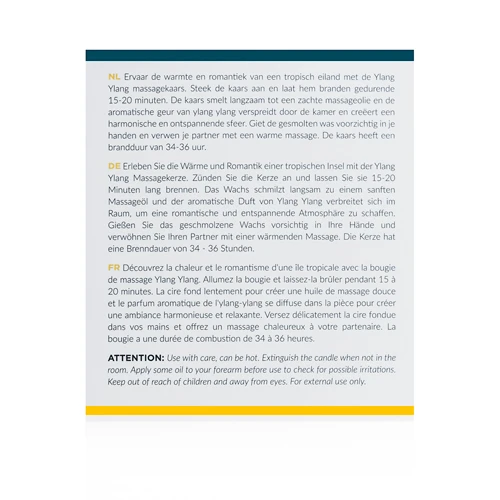 Let op: bij gebruik op een gevoelige huid kan verbranding of reactie van de huid optreden. Het is daarom aan te raden om de kaars altijd vooraf aan gebruik eerst op de huid te testen. Doe dit door de kaars na 1520 branden uit te blazen, een druppeltje was op je handen te gieten en op de huid te testen.