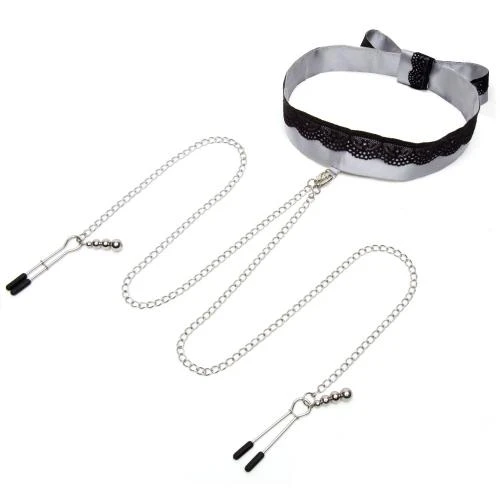Deze satijnen collar met tepelklemmen is gebaseerd op de kinky avonturen van Ana en Christian en bewijst dat bondagespel ook elegant kan zijn. De collar is gemaakt van sensueel, zilver satijn en is afgewerkt met chic, zwart kant. Draag deze tepelklemmen onder je kleding om samen met je partner een kinky geheim te delen.
