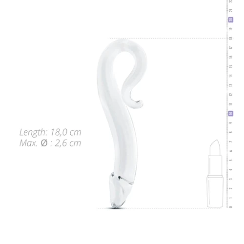 Ontdek de meest gevoelige plekjes met deze bijzondere dildo. De dildo is volledig gemaakt van glas. Hierdoor is de sextoy transparant, sterk en extra glad. De gebogen top maakt het mogelijk om de meest gevoelige plekjes te raken zoals de Gspot en de prostaat. De toy kan veilig gebruikt worden met alle soorten glijmiddel en is voorzien van een handvat voor een goede grip in elke situatie.