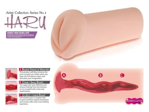 Laat je verrassen wanneer je je laat verwennen door Haru! Haru is een realistische masturbator en ligt altijd en overal voor jou klaar. Het middelgrote model zorgt voor voldoende stevigheid en ligt fijn in de hand. Het materiaal is heerlijk zacht en sluit perfect aan op de penis tijdens penetratie. Haru heeft grote, gladde schaamlippen, een licht genopte opening en een geribbelde, genopte binnenkant mét Gspot. Hierdoor wordt de penis op verschillende manieren gestimuleerd. Breng glijmiddel aan op je penis, smeer Haru in en laat haar over je penis glijden. Waar ga jij genieten?