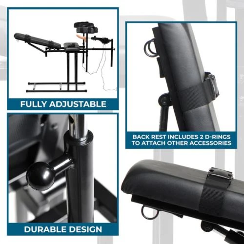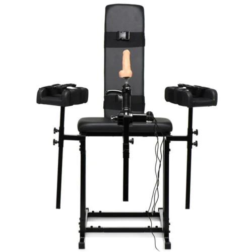Ga achterover zitten, leg je benen omhoog en geniet van luxe kinky comfort met deze verstelbare bondagestoel en compatibele sexmachine! Positioneer jezelf of je partner in de perfecte hoek die voor jullie beiden werkt. Deze stoel heeft een stevig frame dat tot 199 kg kan dragen. Dankzij de verstelbare rug en beenleuningen zijn de mogelijkheden eindeloos. De zachte schuimkussens zijn bedekt met PVCleer en de gespen zijn gemaakt van ABSplastic waardoor het zeer duurzaam is. Aan de zijkanten zijn Dringen bevestigd waardoor je eenvoudig polsboeien of andere bondage accessoires kunt toevoegen.