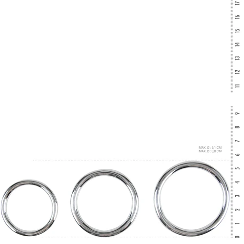 Ontdek je perfecte maat met deze cockring set van Sinner Gear. De set bestaat uit 3 metalen cockringen die om de penis, balzak en eikel gedragen kunnen worden. De ringen zijn sterk, zwaarder dan de meeste cockringen en te gebruiken met elk glijmiddel. Afmetingen ringen: Klein: binnendiameter 4 cm, buitendiameter 4.5 cm Medium: binnendiameter 4,50 cm, buitendiameter 5,50 cm Groot: binnendiameter 5,00 cm, buitendiameter 6,00 cm