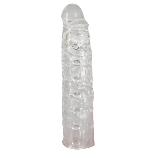 Met deze transparante penis sleeve haal je een uniek speeltje in huis. Hij is anders dan andere sleeves doordat hij in lengte aan te passen is. Met een schaar kun je eenvoudig de overtollige lengte van de onderkant afknippen, zodat hij perfect om jouw penis past. Hij maakt jouw penis zowel dikker als langer. Niet alleen door deze verlenging en verdikking zal jouw partner heerlijk van de sleeve kunnen genieten, maar ook door de stimulerende textuur met aderen en noppen.